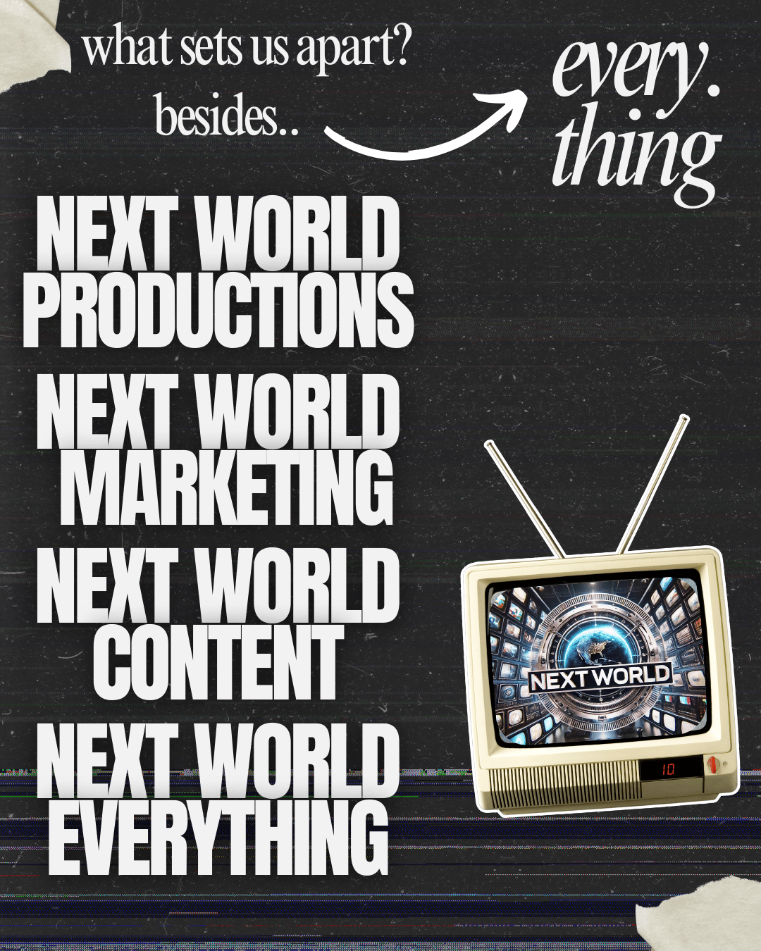 We see beyond today. At Next World, our vision blends the artistry of elite production with powerful technological innovation. Our approach is strategic, bold, and precise—always ahead, always evolving. While others chase what's next, we're already there.